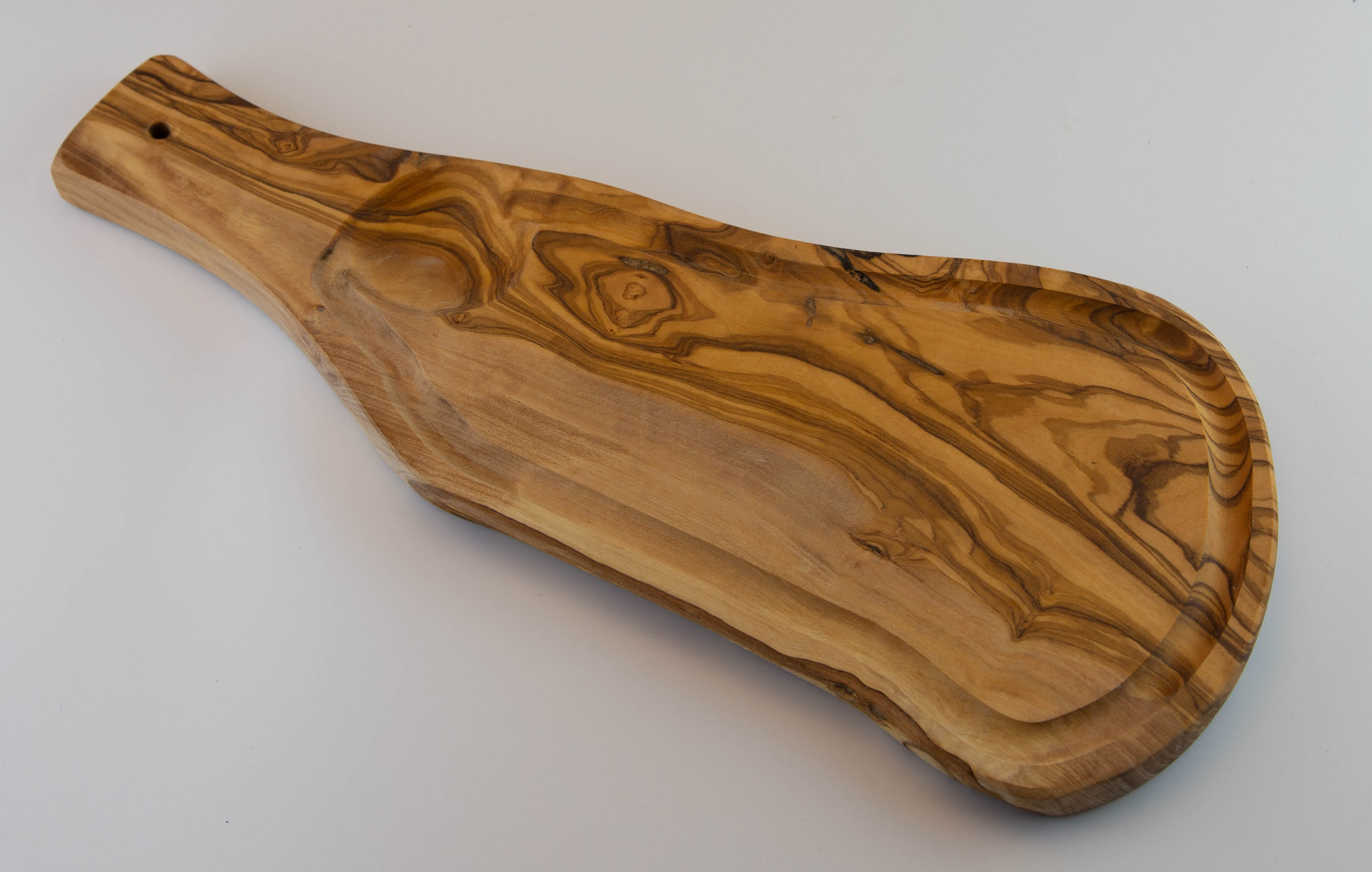 Formschönes Servierbrett mit Griff und Saftrille mit einer Länge von 45-50 cm.